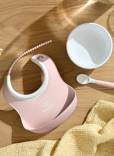 The baby bowl and the feeding spoon can be used from approximately six months of age. The baby bib is from about four months of age.