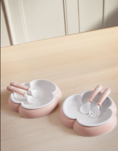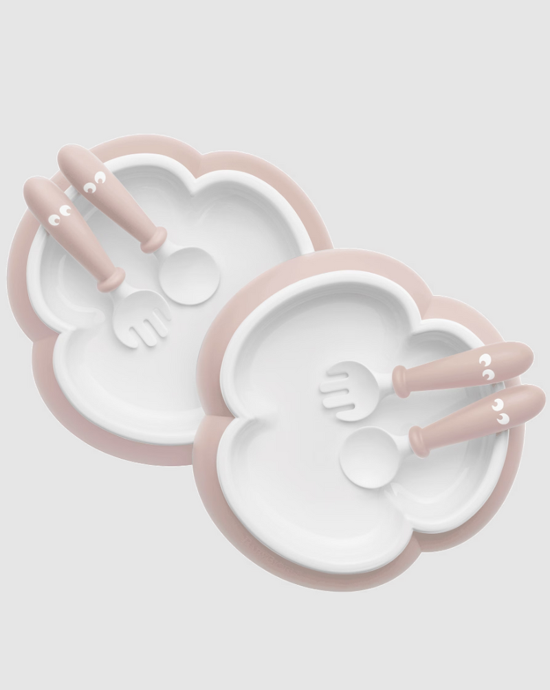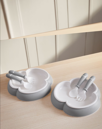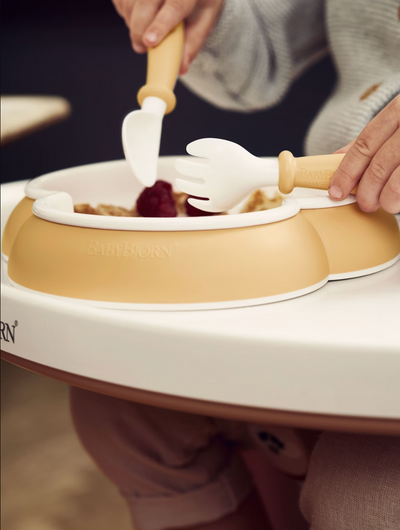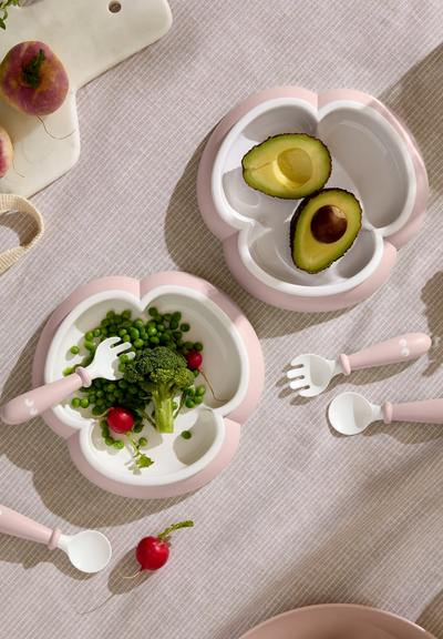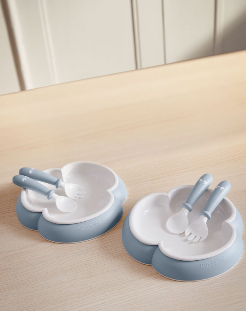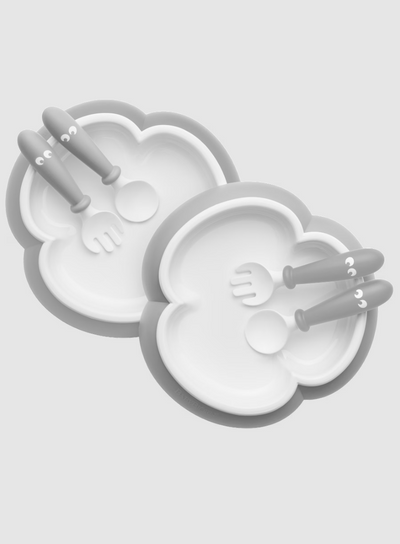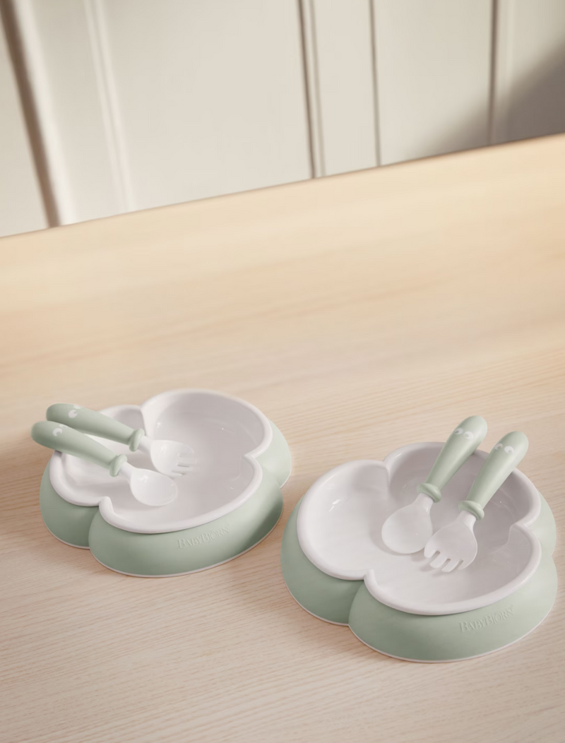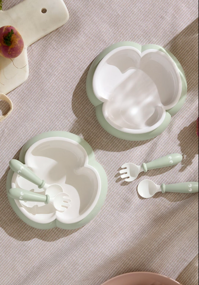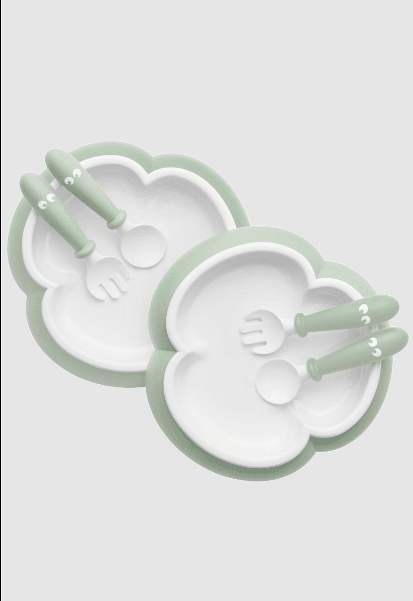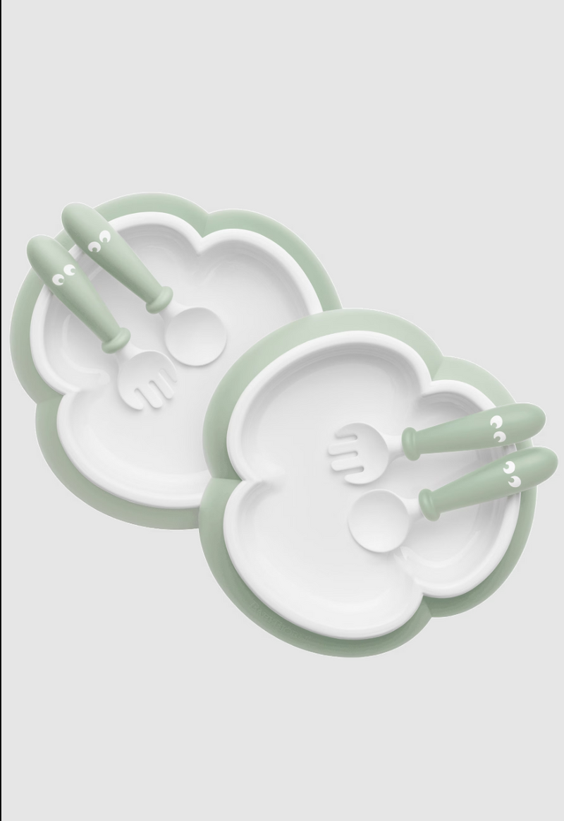 In addition to their appealing colors and shapes, the plates, spoons and forks are specifically designed for very young children. The plate’s trefoil shape makes scooping up food easier, while the strip underneath prevents the plate from sliding around. The spoon and fork are shaped to not slide down into the plate, and the short handles are easy to grip.
