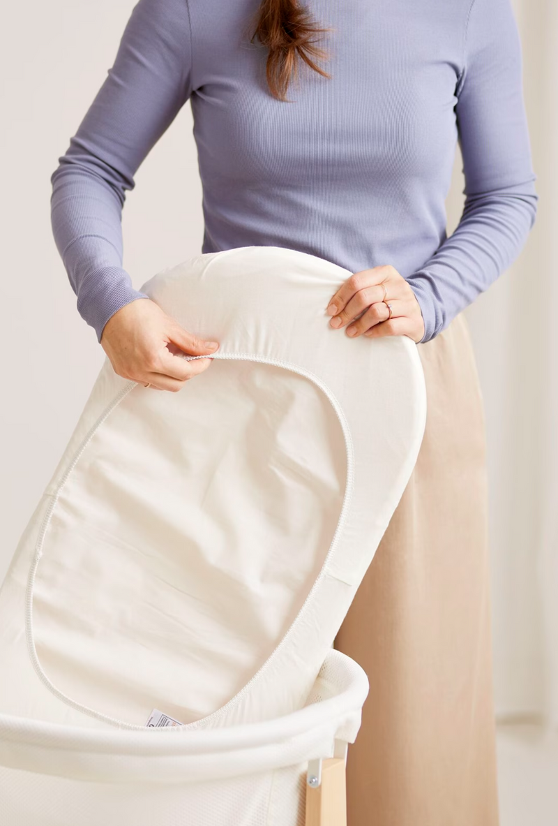 The fitted sheet for Cradle is easy to put on and take off. Machine wash, hot (60°C). Do not tumble dry.