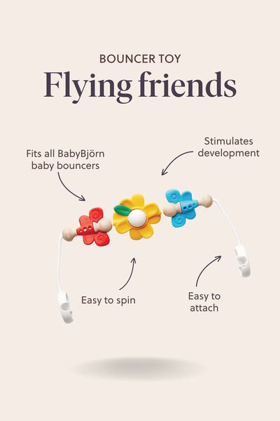 Make playtime in the baby bouncer even more fun for your baby with brightly colored toys they can look at and spin around! The rotating figures spark your baby’s curiosity and may even elicit baby’s first smile. Playing also helps your baby discover physical capabilities and develop motor skills. The toy bar is easy for a grown-up to attach and remove, and fits both Bouncer Balance Soft and Bouncer Bliss.