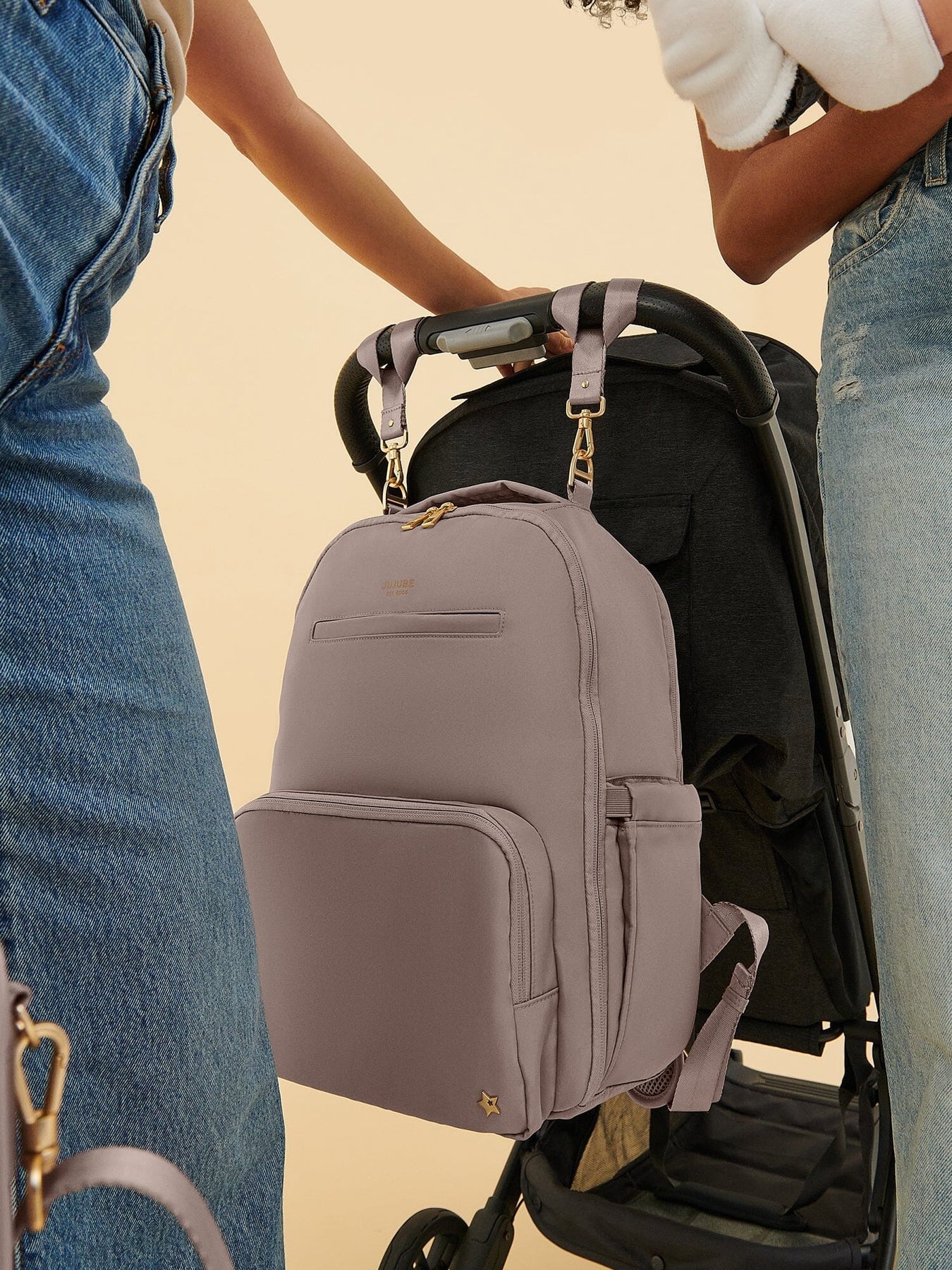 Meet the Classic Backpack from JuJuBe—your new BFF for all things Baby! This chic and functional diaper bag backpack is crafted from durable, machine-washable fabric and packed with features designed to make parenthood easier. It easily fits diapers, snacks, drinks, and extra clothes, and features two insulated bottle pockets, a quick-reach cell phone pocket, and an elastic key leash, help you to be a multitasking pro. Plus, the adjustable shoulder straps, trolley sleeve, and cushioned changing pad add comfort and convenience on the go. Whether you’re heading to playdates or family outings, this backpack helps you stress less so you can focus on making every moment special!