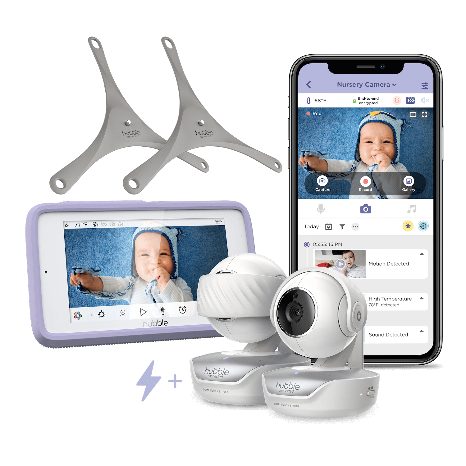 The Hubble Connected Nursery Pal Deluxe is a smart baby monitor designed to grow with your child. Featuring a 5″ HD touchscreen parent unit, it provides clear monitoring while transforming into a child-friendly interactive viewer with games, videos, and stories. With a portable, battery-powered camera, infrared night vision, remote pan/tilt/zoom, and secure connectivity through the HubbleClub app, it delivers flexibility, security, and peace of mind from infancy through toddlerhood.