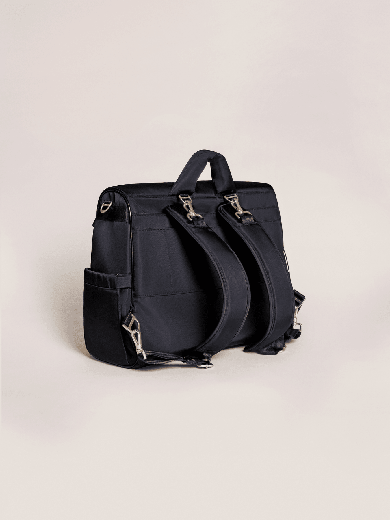 The Satchel from JuJuBe features a lightweight, versatile construction with 14 storage compartments, removable stroller straps, and a trolley sleeve for travel, all in a distinctive silhouette. Convertible straps make it wearable in three different ways—as a satchel, backpack, and messenger bag—so you can keep diapers, clothes, snacks, toys, and more organized in style and comfort. The insulated bottle pocket keeps drinks and snacks at the perfect temperature, while the water-repellent and odor-resistant lining and durable metal hardware make it sturdy enough for any adventure. There’s no need to sacrifice on the fashion front either—the artfully designed Satchel is as chic and sophisticated as it is functional.