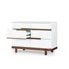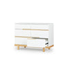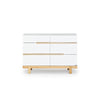 Experience organizational bliss with the 48" Bliss 6-Drawer Dresser - a stylish solution for storing all of baby's necessities. Its sturdy rubberwood legs and innovative drawer design bring a playful energy to any room. Use it alone or pair with a changing table to maximize space in the nursery (or anywhere else that could use some lighthearted organization).
