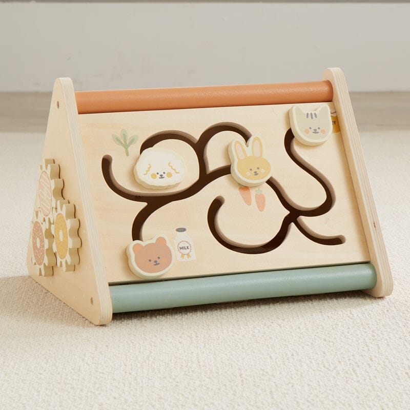 Made of wood, our triangle features counting hand, peek-a-boo numbered doors, an alphabet abacus with 2-sided graphics, a maze, a mirror, and gears.