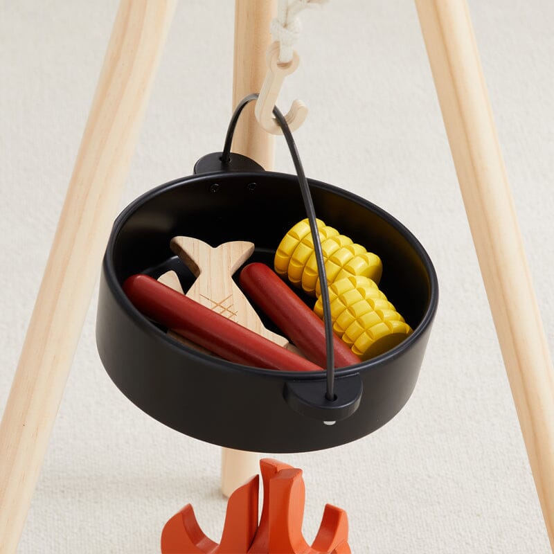 They can cook up all the fixings in the wooden pot, including 2 wooden corn on the cobs, 2 wooden hot dogs, 2 freshly caught wooden fish, campfire, and 3 sets of logs with wooden ax that can split them into sections.