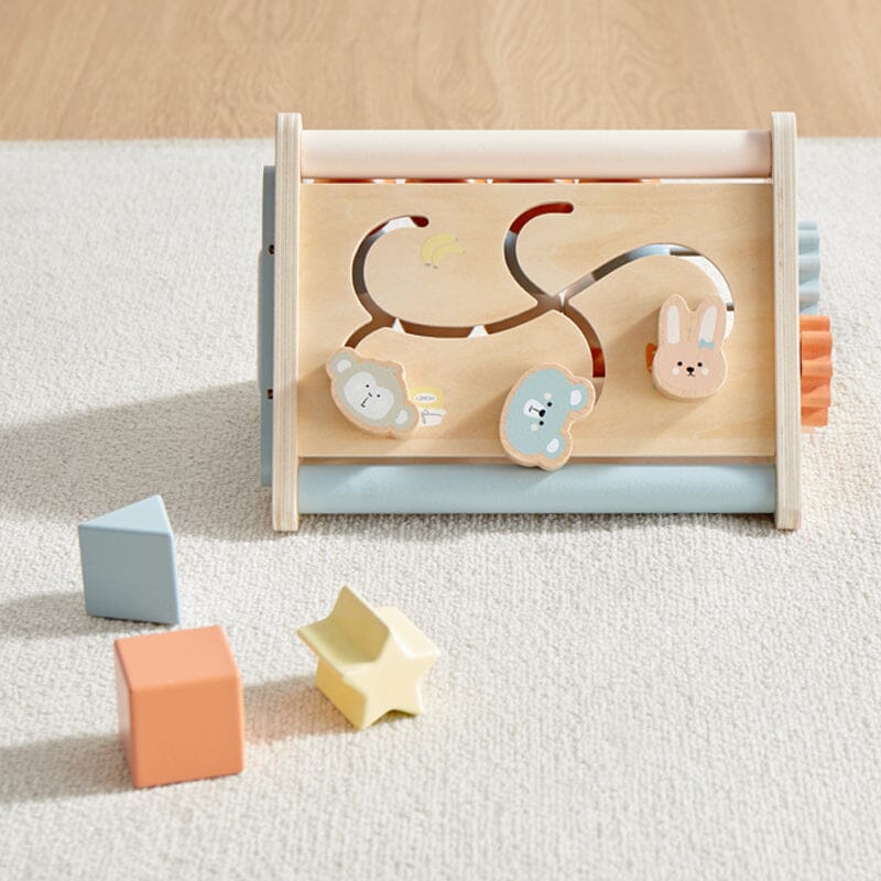 Three-sided activity hub with abacus, shape sorter, character maze, gears & a mirror-door.