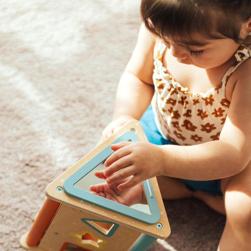 Our wooden triangle comes complete with abacus, shape sorter with 3 shaped blocks, character maze, gears, and a mirror that doubles as a door that opens to store and retrieve blocks.