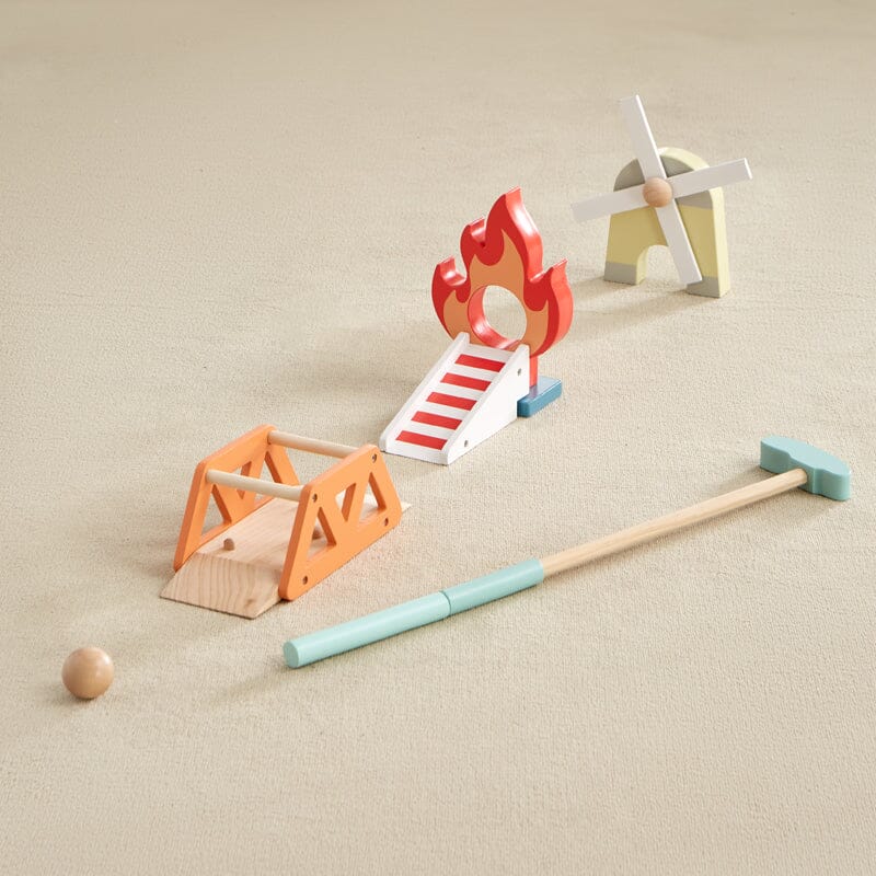 Your kiddos will love our Putt Putt Golf Set! Our 8-piece set includes shark with tongue, 3 sized mountains, flame and ramp, bridge, windmill, and hole with flag.