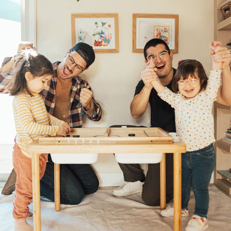 Totally kid powered: pull-back the elastic behind your puck and let it rip!