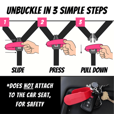 Works as an opener on all child car seat buckles (including infant rear-facing, convertible and booster seats that use a 5 point harness seat belt) and many strollers, high chairs and other push-button devices