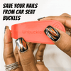 Patented lever arm reduces the force needed to unbuckle an infant or toddler 5 point harness buckle by more than 50 percent to help anyone with limited hand strength or long nails