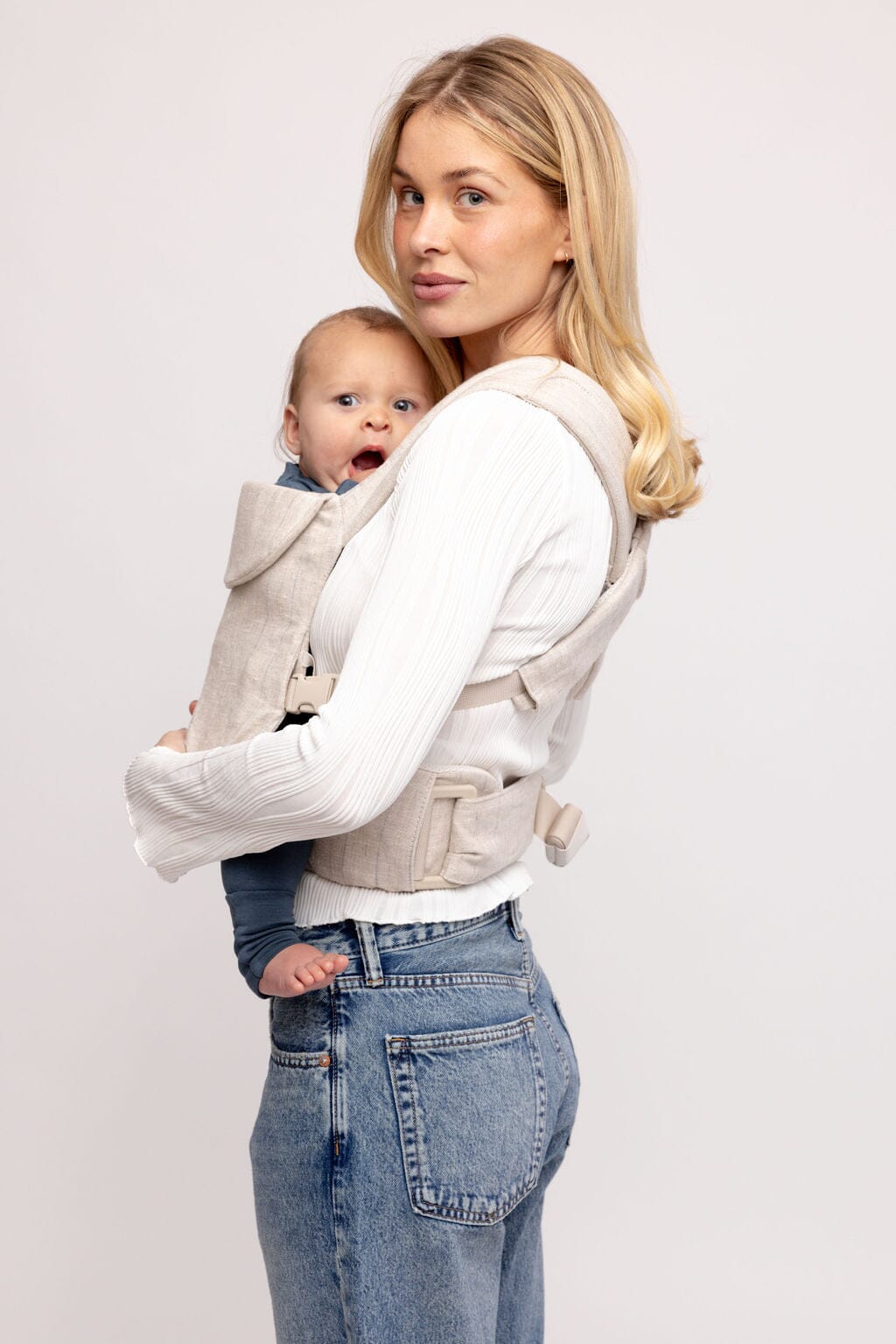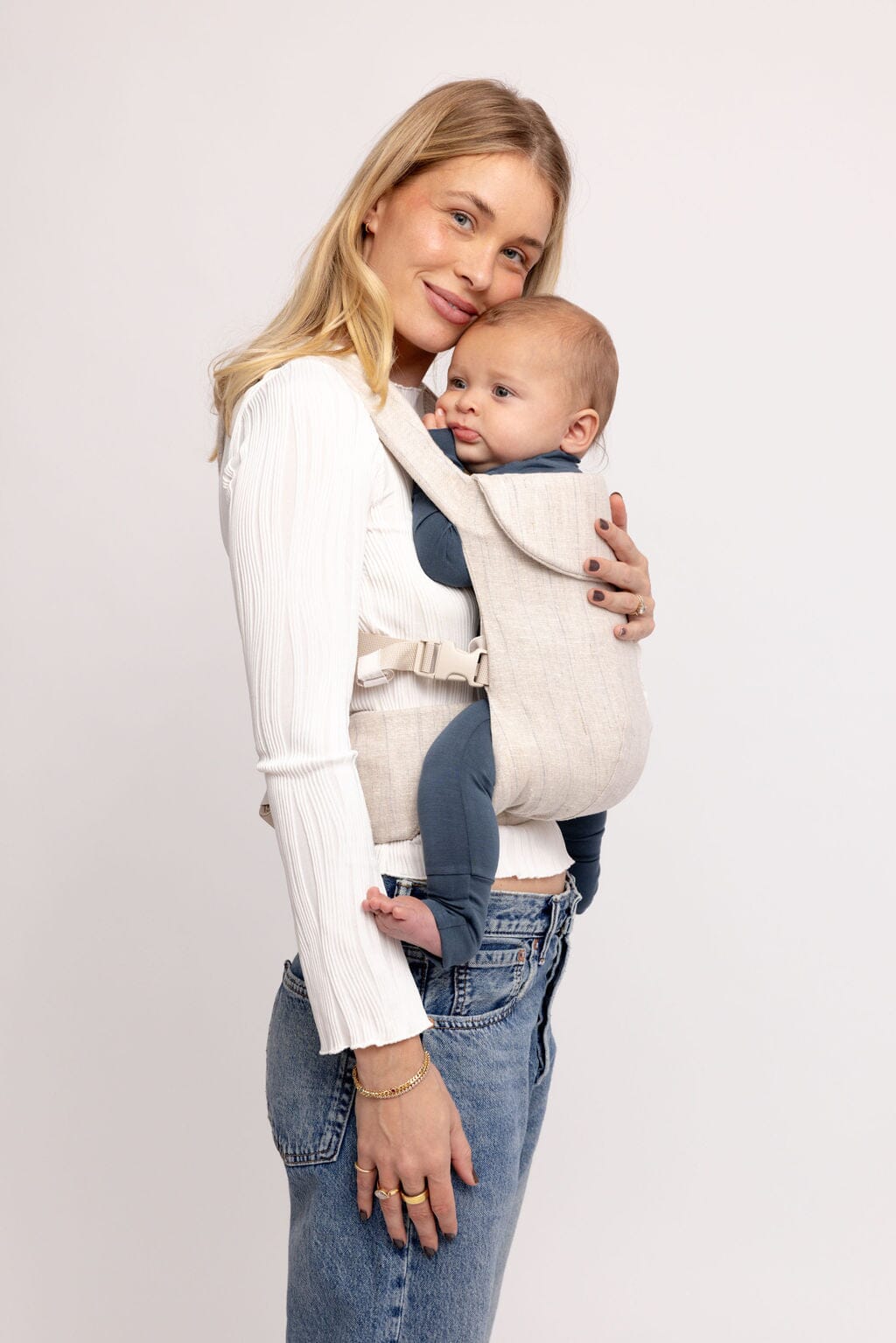 Classy blue pinstripe against the prettiest neutral oatmeal shade.