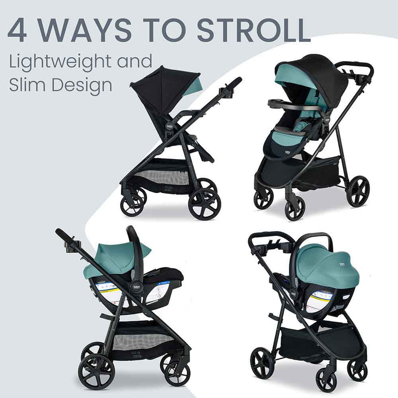 Four Ways to Ride: Parent-facing infant seat, forward-facing infant seat, parent-facing toddler seat, and forward-facing toddler seat.