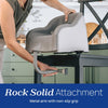For greater flexibility, the Cinch™ also includes adjustable attachment straps that secure the booster to the chair without using the arm. When not needed, the metal arm folds neatly underneath the booster.