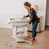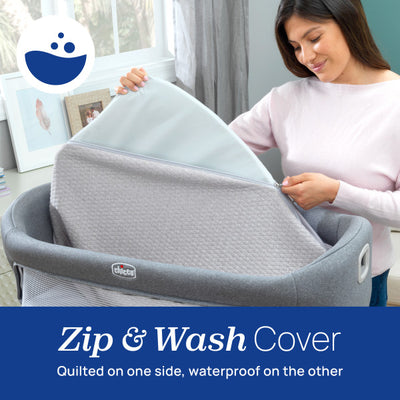 When it’s time for a diaper change, simply flip the mattress to reveal the waterproof changing pad and lower the bassinet walls for quick, easy access. Both the bassinet and mattress fabrics zip off and are machine washable, making cleanup simple and hassle-free.