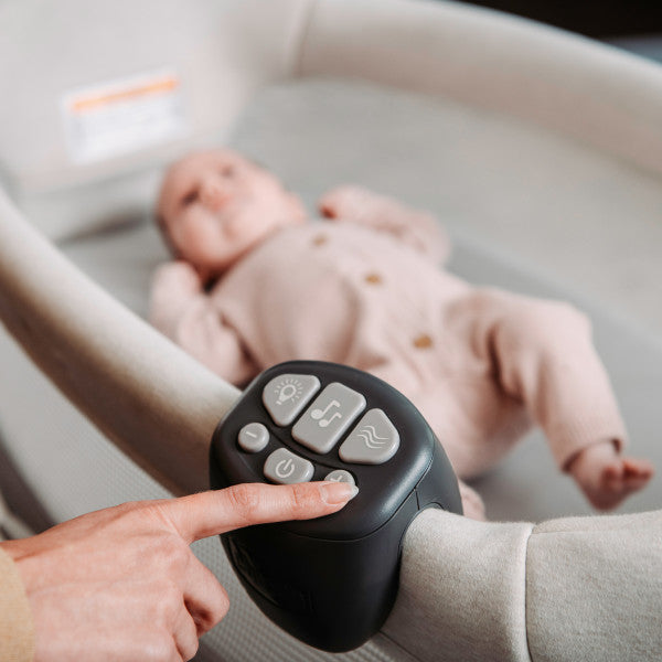 The Close to You features swivel wheels, breathable mesh side panels, and a wide range of height adjustments so baby can sleep safely within arm’s reach while remaining in their own designated space. The bassinet fabrics include organic cotton for natural softness and comfort. A plush mattress paired with soothing melodies and gentle vibrations helps create a calm, restful environment for sleep.