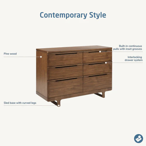 The Embraced Forms 6-Drawer Dresser is designed to grow alongside your child, offering six deep drawers that provide generous storage for clothing, essentials, and keepsakes. Crafted from pine wood and composite wood materials, this dresser features a distinctive sled base with curved legs that enhance its sculptural appeal. Its continuous built-in drawer pulls with inset grooves wrap smoothly around the frame, bringing a sleek, modern touch to the overall design.